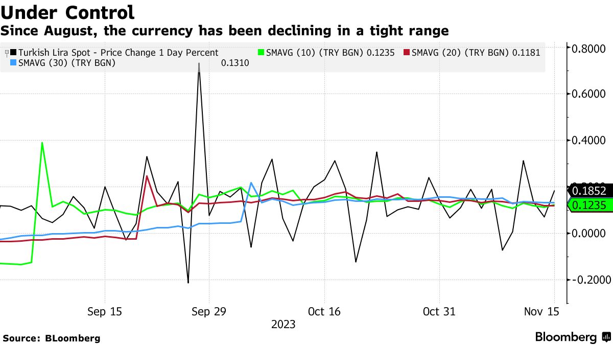 尽管该货币仍在持续贬值——过去三个月几乎每天都创下历史新低——但其日损失幅度一直被控制在一个非常狭窄的范围内,平均略高于0.1%。因此,一个月的隐含波动率,即货币价格预期波动的指标,本月跌至不到10%,接近今年最低水平。