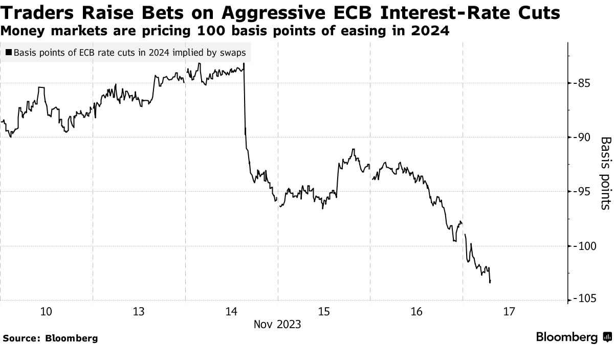 尽管欧洲央行理事会成员强调存款利率将一直保持在4%至2024年,但货币市场正在押注明年4月就会降息,目前已经定价了整整一个百分点的降息明年。