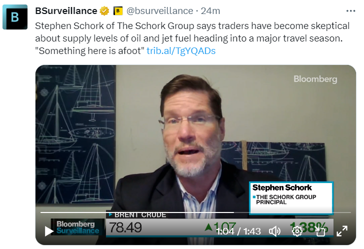 Schork Group的Stephen Schork正在努力弄清石油价格方程中缺少了什么。中东的战斗和沙特的供应削减不应该导致原油熊市。但今天布伦特原油价格为78美元,情况正好相反。