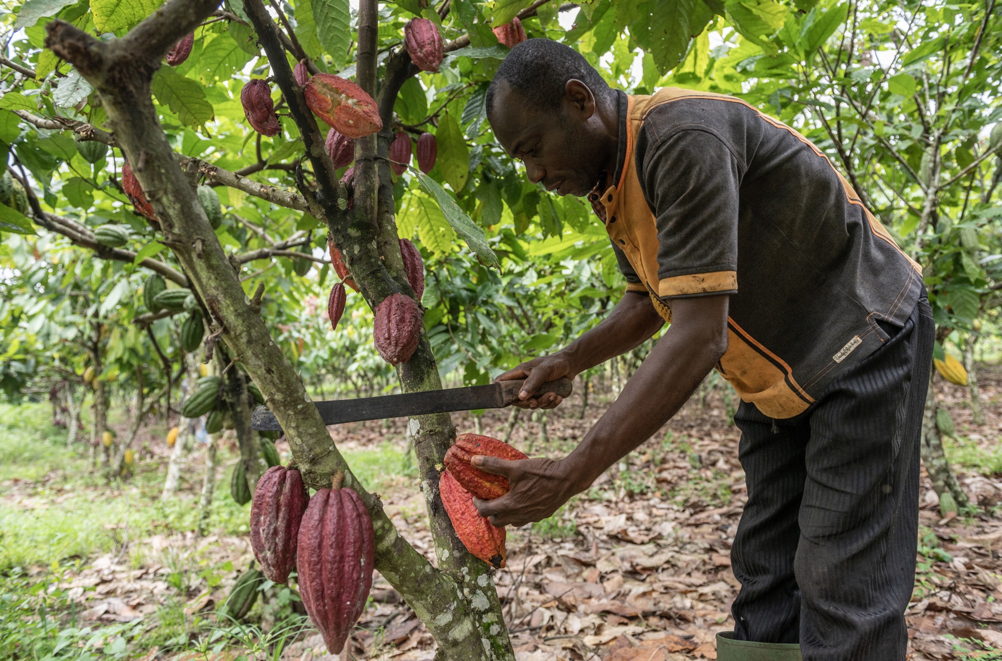 在科特迪瓦的阿扎吉,一位农民正在采摘可可豆荚。今年全球可可价格上涨,因为科特迪瓦和加纳等主要种植国的作物受挫,供应变得紧张。