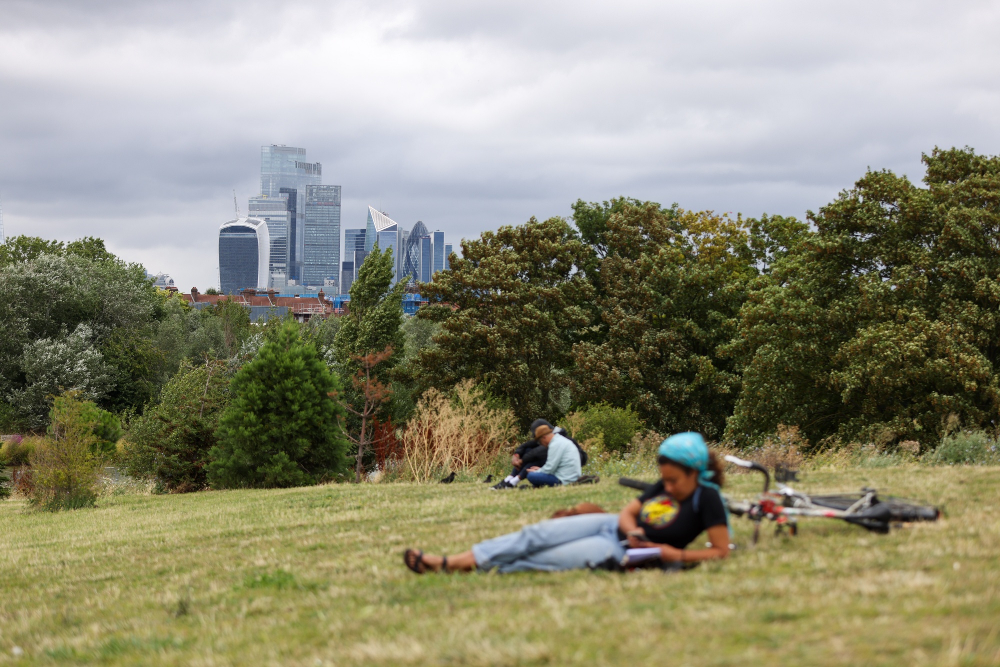 游客们在伦敦伯吉斯公园放松身心,眺望伦敦城市天际线