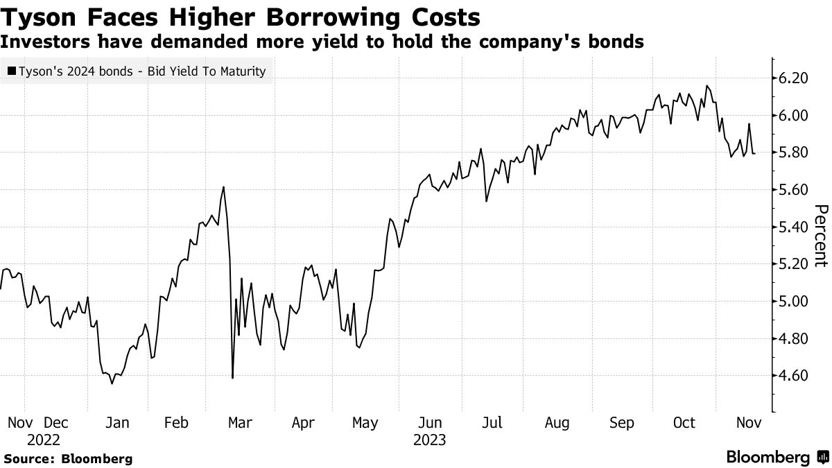 这家肉类生产商发行的债券今年平均下跌了1.3%,在彭博投资级评级食品和饮料公司指数中表现最差,而该指数在此期间上涨了0.9%。