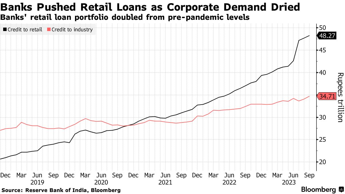 印度储备银行的限制对印度的影子银行和金融科技公司特别严格,这些公司的监管程度不如银行那么严格。根据印度储备银行的数据,截至3月,过去四年里非银行机构的个人贷款组合以30%的复合年增长率增长。