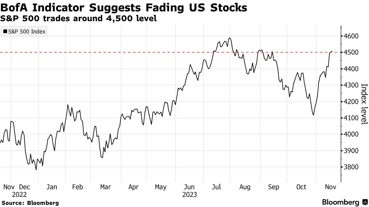 美国银行自己的牛熊指标在过去五周发出了反向买入信号。股票历史上从这一买入信号开始通常会上涨1%到3%,这将代表标普500指数这一轮的目标为4500点。Harnett一直对股市持悲观态度,尽管股市出现了反弹,他建议“在这些水平以上淡化”。美国基准指数周四收于4508点。