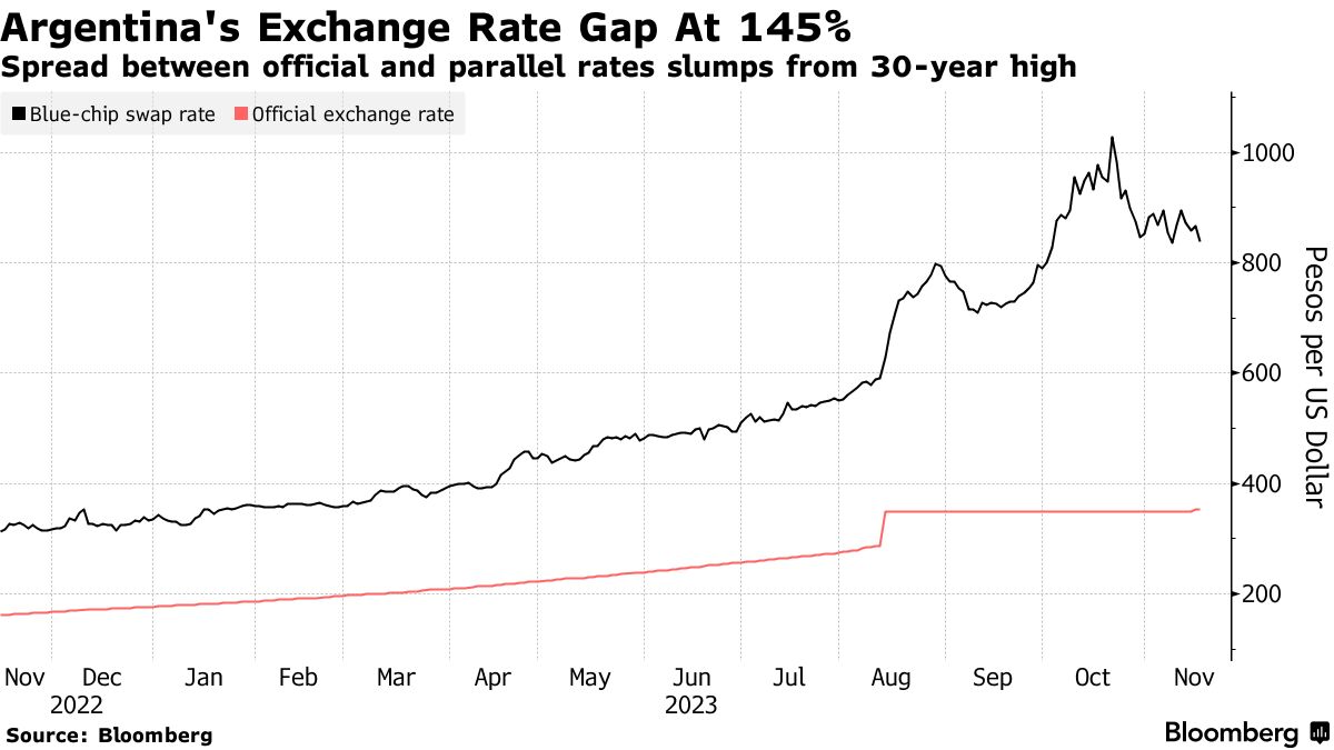 在第一轮选举之前,随着阿根廷人为了选举后长期拖延的货币贬值做好准备,这一差距激增,但自那时起已经缩小。本周,政府实施了所谓的爬行固定汇率,周三贬值了1%的比索,其余的2%分散在11月的其余时间。