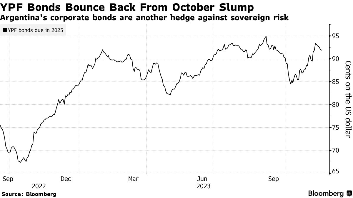 例如,国有电力公司YPF SA的到期日为2025年的债券,其价格从10月初的低点上涨了超过10美分,达到了面值的93美分。