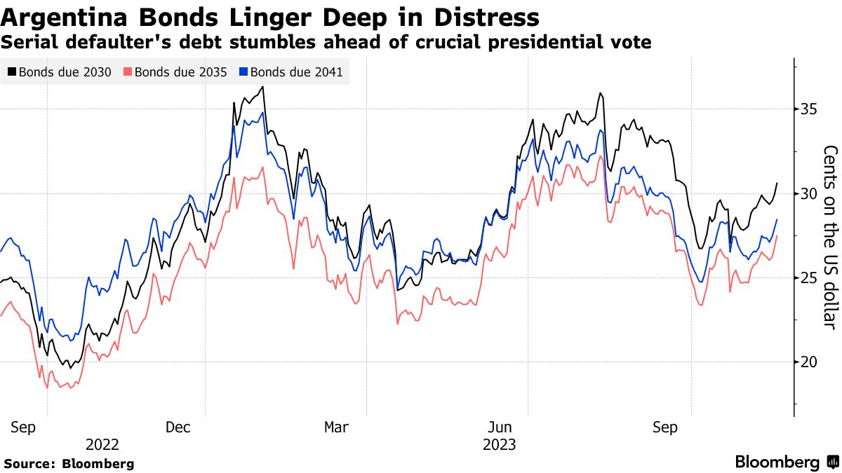 阿根廷的主权债券大部分交易价格低于面值的30美分,收益率表明交易员正在为该国的第10次违约做准备。在Milei领先的初选和Massa领先的第一轮投票后,债券价格下跌。