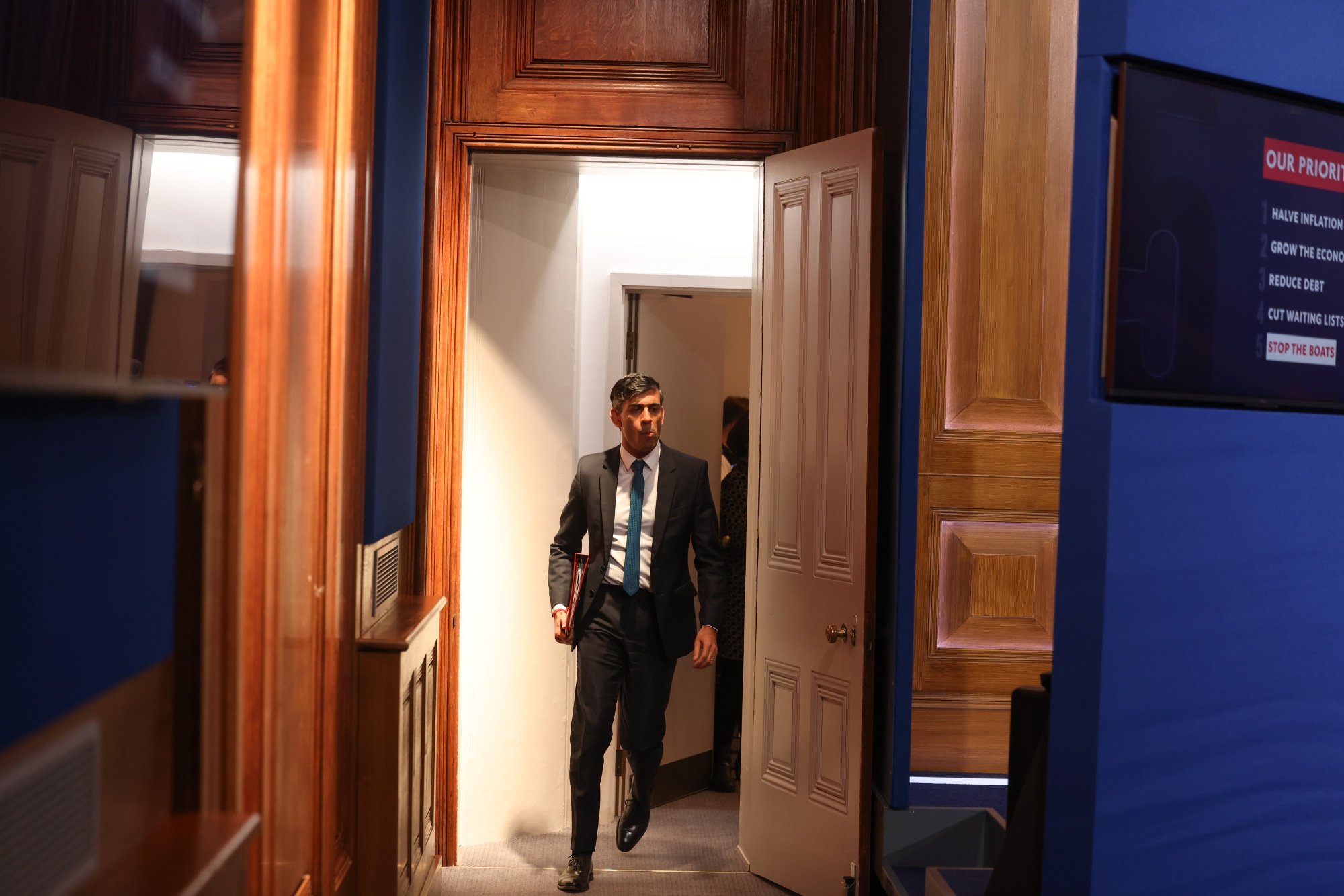 英国首相里什·苏纳克(Rishi Sunak)出席唐宁街新闻发布会。摄影师:克里斯·拉特克利夫/Bloomberg到周三下午,很明显苏纳克在下议院的条约策略并没有收买右翼。几名保守党助手和议员表示,他在新闻发布会上强硬的措辞,以及首相府坚持要财政大臣杰里米·亨特在下周的财政报告中向保守党右翼提供大规模减税公告,显示出苏纳克对自己的位置有多么担忧。