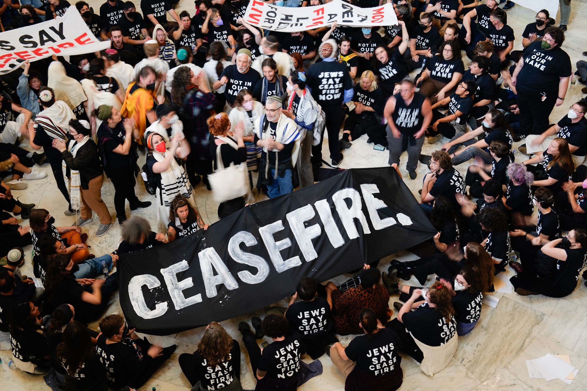 2023年10月18日,位于国会山的一座众议院办公楼外,犹太人声援和平的抗议者。摄影师:肯特·西村拉/彭博社过去一个月,五角大楼悄悄地增加了向以色列提供的武器,包括激光制导导弹和掘地弹。在美国,这场战争引发了大学校园上的紧张局势,并引发了亲以色列和亲巴勒斯坦的抗议活动。