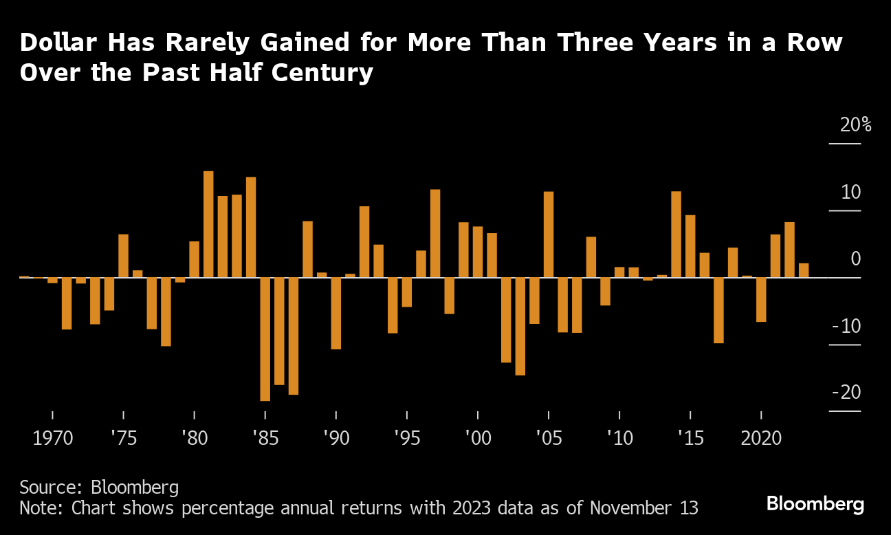 美元在过去50年中很少连续上涨超过三年。那些猜测美联储最终结束加息的交易员再次让美元处于守势。彭博指数显示,美元周五下跌,使其本周下跌了1.5%,这是自7月中旬以来的最大跌幅,也抹去了2023年的涨幅。此外,疲软的美元推动了今年表现最差的G10货币之一——日元的升值。