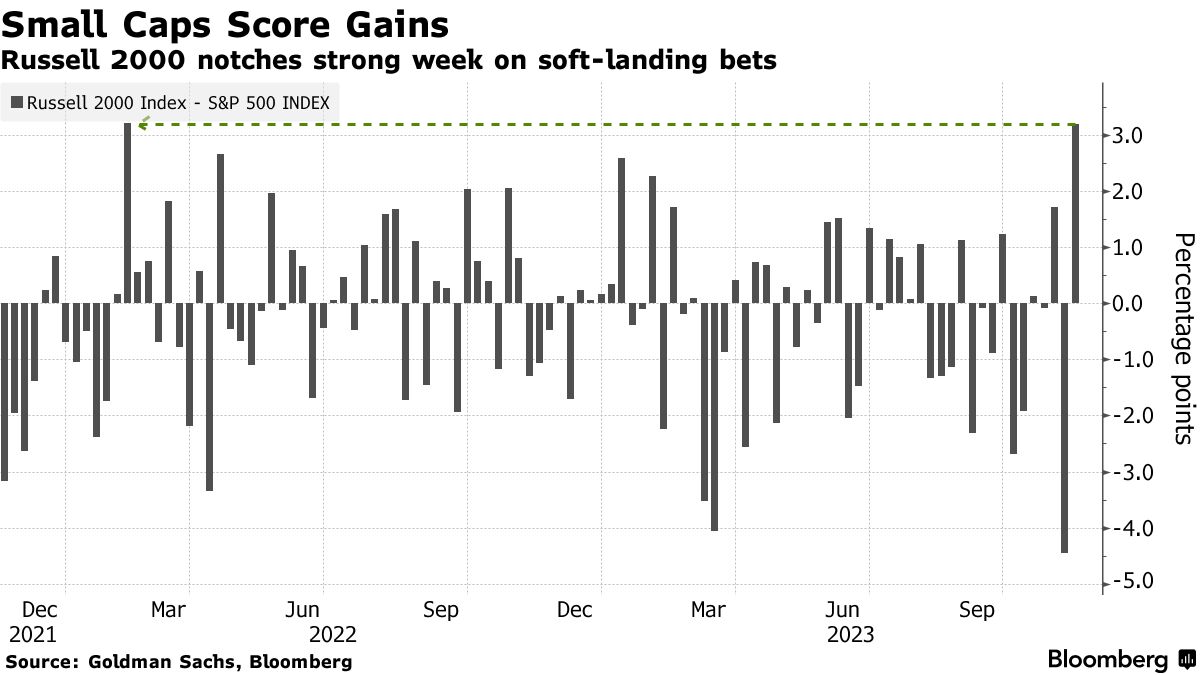 投资者越来越确信央行已经结束了其历史性的紧缩行动,并计划在明年上半年进行降息。小盘股罗素2000指数上涨超过5%,而汽车制造商和银行股也大涨。根据EPFR Global的数据,全球股票基金吸金第二大,而ARK创新ETF(ARKK)则迎来了今年吸金最佳的一周,交易者选择了对利率敏感的高风险科技股。