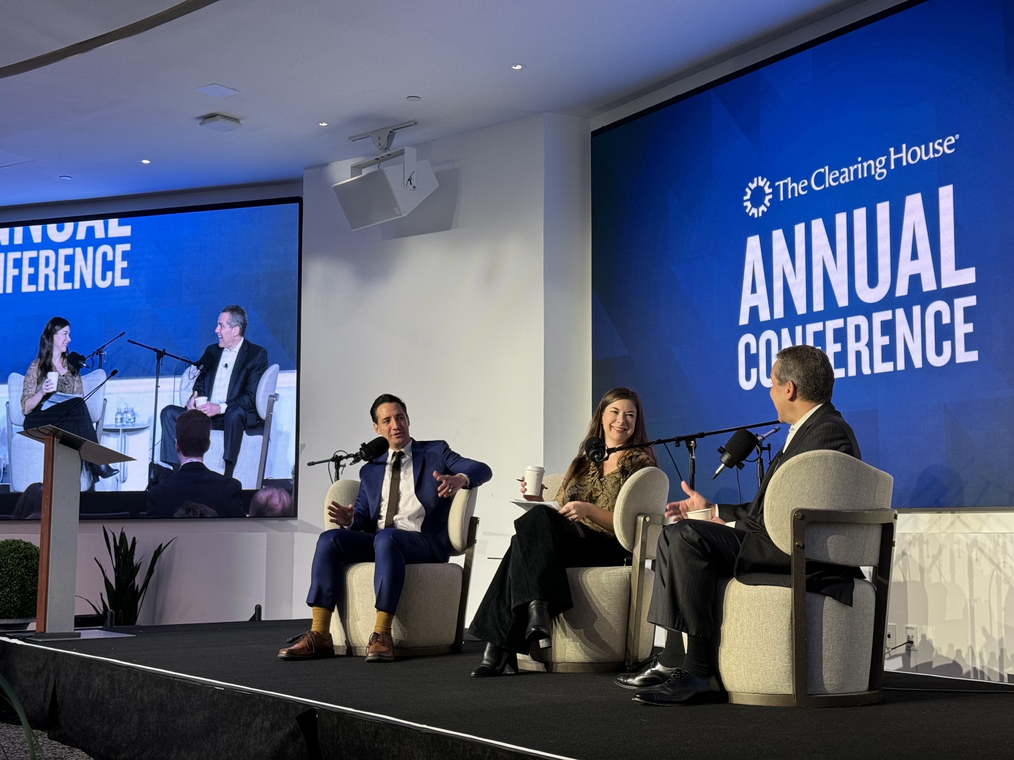 乔·韦森塔尔、特雷西·阿洛维和联邦储备委员会的迈克尔·巴尔在纽约的清算银行年会上台发言。
