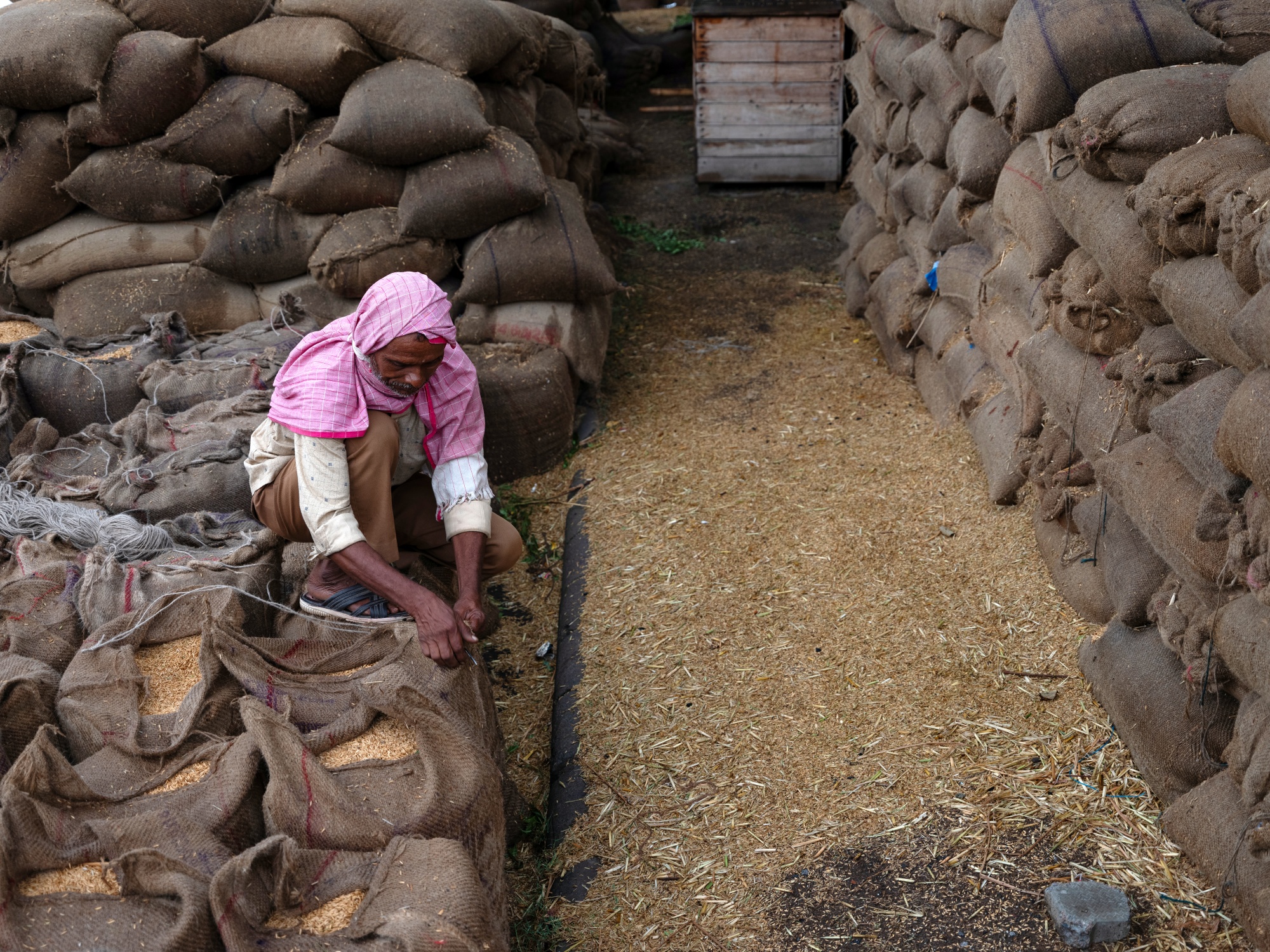 印度哈里亚纳邦的批发市场工人在10月份封装稻谷。摄影师:Anindito Mukherjee/Bloomberg通过Menaka Doshi的印度版新闻简报注册——这是对新兴经济强国、其崛起背后的亿万富翁和企业的内幕指南,每周发送一次。