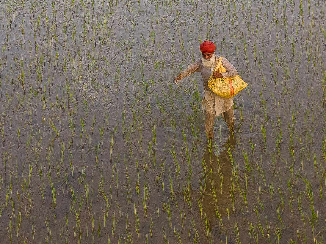 旁遮普邦西尔西瓦拉村的农业劳工给稻苗撒肥。摄影师:Anindito Mukherjee/Bloomberg**重要的储备。**作为全球最大的稻米出口国,印度可能 继续限制出口,甚至在明年的国家选举之后,将价格保持在2008年粮食危机以来的最高水平。