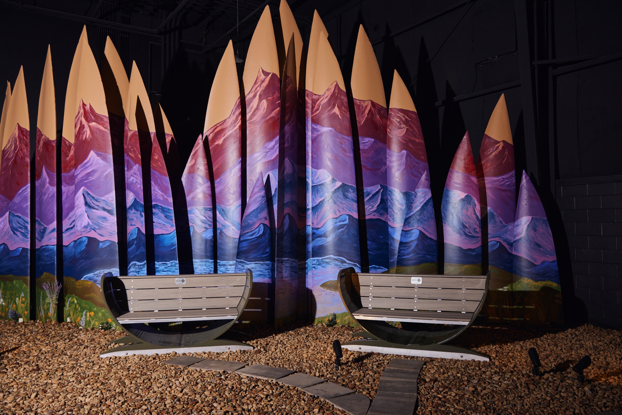 由回收的风力涡轮机叶片制成的长凳和其他产品。摄影师:Brian Kaiser/Bloomberg大刀为了防止废弃的风力发电机叶片堆积在填埋场,初创公司正在将它们切碎并转化为回收物品,比如公园长凳。