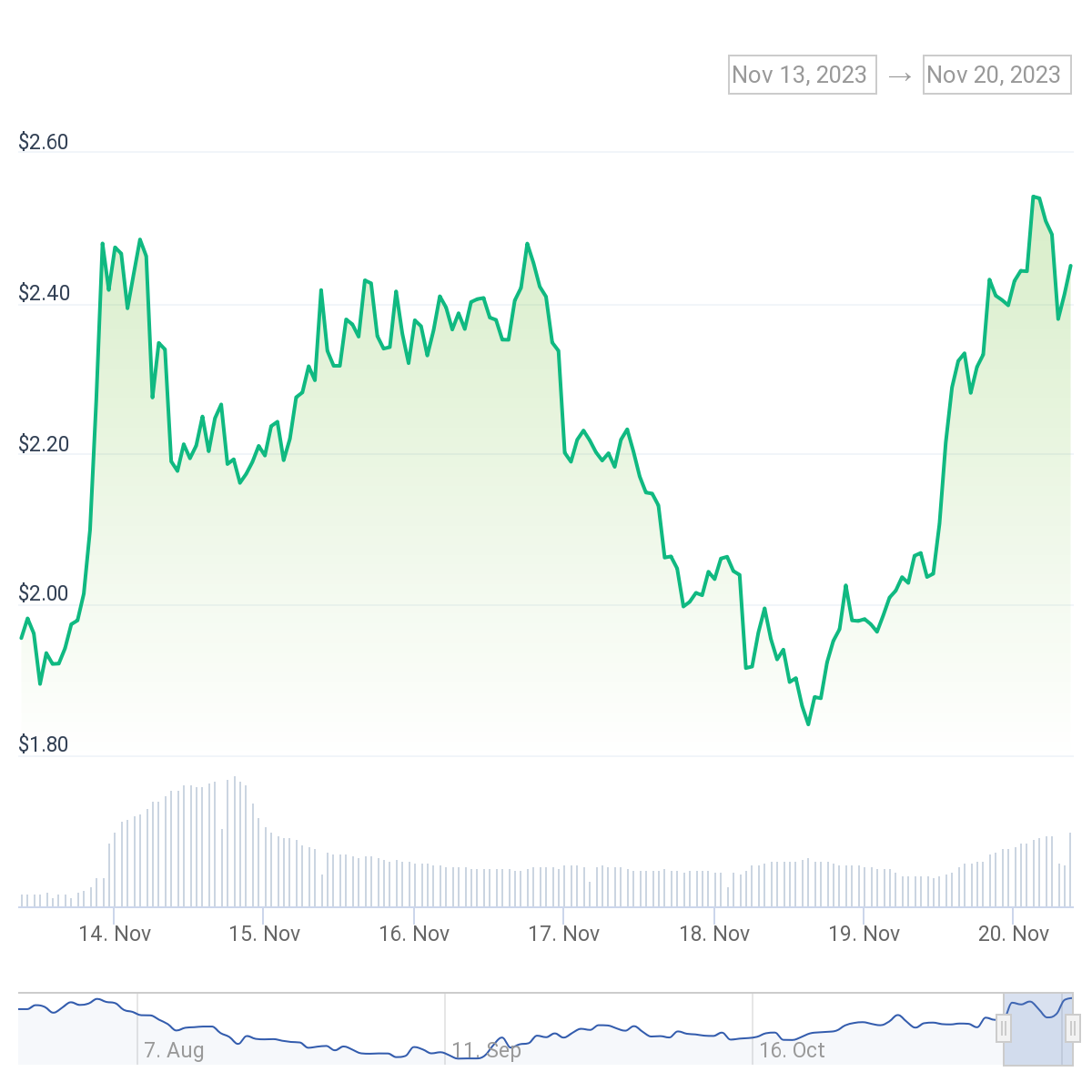 Worldcoin,也被称为WLD,在24小时内已经上涨了18%,重新达到$2.40的水平,这是在一群OpenAI高管和投资者努力恢复Altman担任首席执行官的努力下。根据CoinGecko显示,该代币的市值约为2.8亿美元,在新加坡时间周一上午8:51时,在加密货币市场中排名第157。