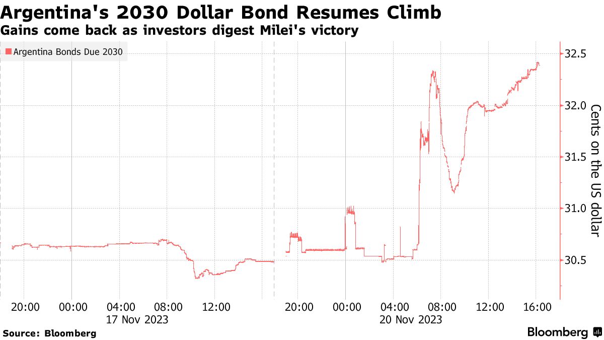 阿根廷股票飙升,债券上涨,投资者为Milei的胜利欢呼 - 彭博报道