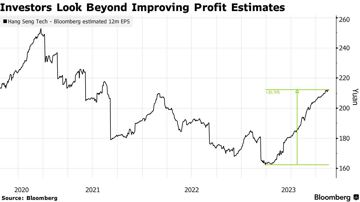 从积极的一面来看,恒生科技指数的盈利预期已经从4月份的低点反弹。但最新的盈利可能对进一步上涨构成障碍。