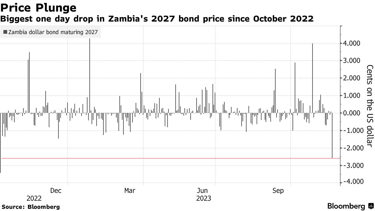 赞比亚的美元债务在中国和法国等官方债权人拒绝接受修订后的债券持有人重组提议后暴跌,这导致了悬而未决的30亿美元未偿债券的重组。