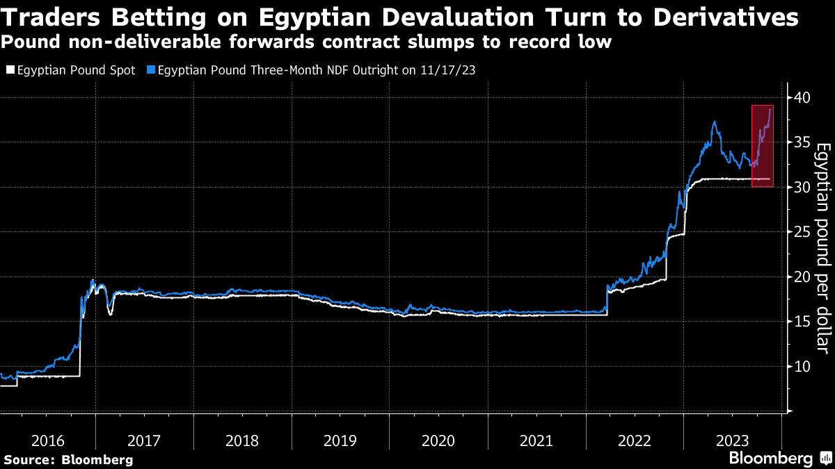 投资者越来越倾向于认为埃及将在12月选举后允许其货币大幅贬值。衍生品市场,既用于对冲风险,也用于投机,正在复苏,因为交易员们为2022年3月以来的第四次贬值做好准备。