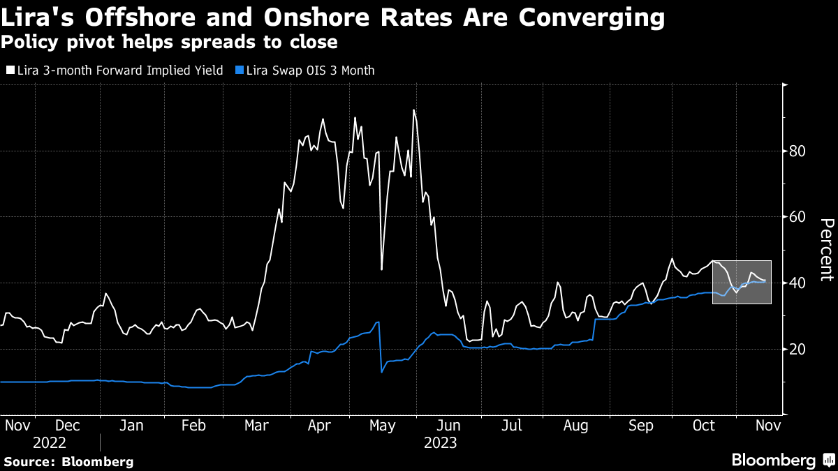 **货币信号:**土耳其国内外里拉利率的趋同可能为解除阻碍外国投资者的货币限制铺平道路。与此同时,土耳其货币再次开始吸引套利交易者。