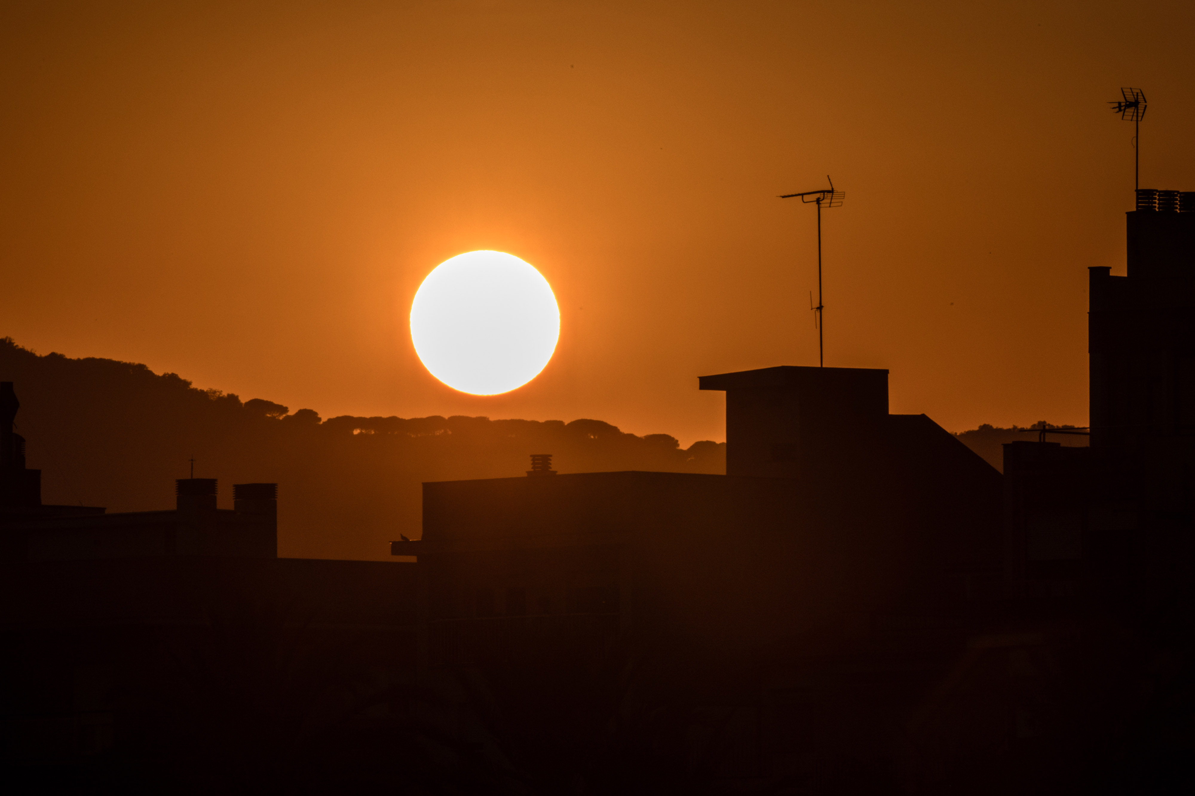 太阳在2023年8月23日落在西班牙马塔罗的住宅屋顶之后。