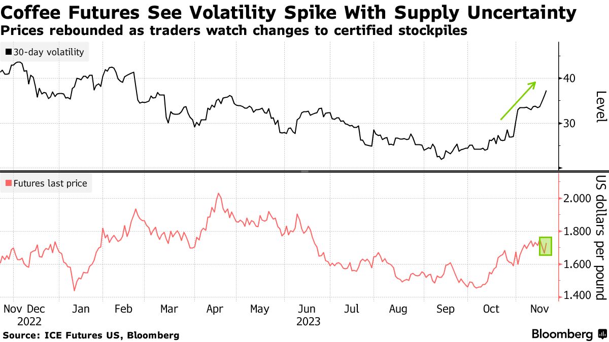 咖啡期货看到波动激增,全球供应不确定-彭博社