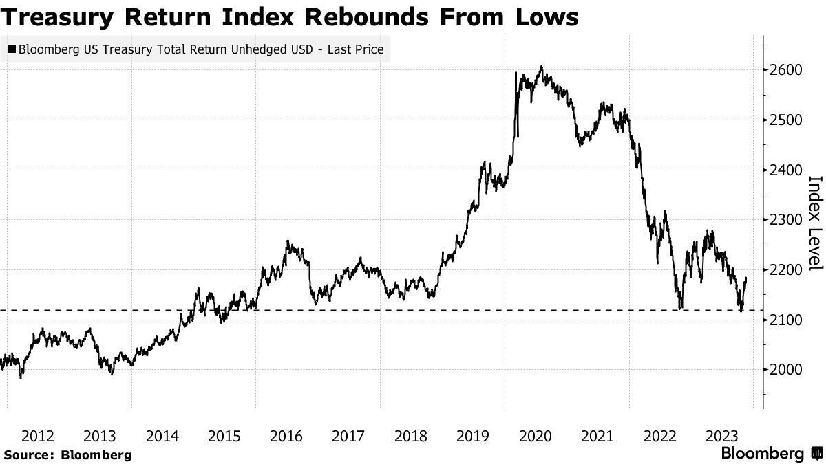 根据彭博社编制的数据,截至上周五,美国国债本月上涨了2.6%,使其今年的亏损仅为0.2%。