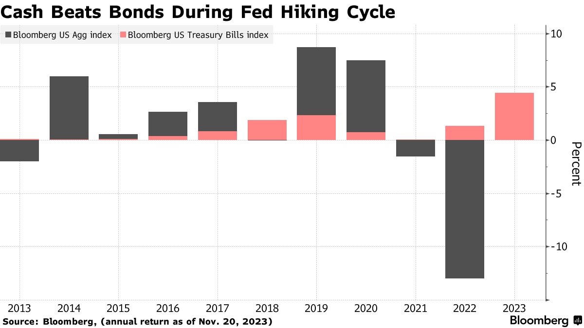 通胀减弱和增长放缓的迹象推动了彭博美国综合指数在11月份的3.6%飙升,使其在2023年的回报率达到约0.7%。这仍然远远低于今年现金的收益。但它展示了在一个被价格压力和美联储政策的虚假迹象所标志的一年之后,一个真正的转折点可能会带来什么。