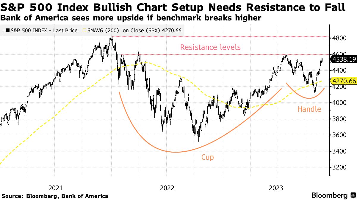 美国股市在接近决定性的牛市突破时有“更大的上涨潜力”,美国银行的技术策略师斯蒂芬·萨特迈尔写道。如果标普500指数能突破低4600点,将确认从2022年初开始的“牛市杯柄”模式,引发更多涨势,他补充说。