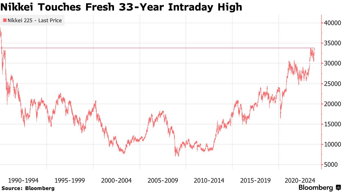 日经今年上涨约28%,受益于日元持续疲软、实体公司盈利和东京证券交易所倡导的企业治理改革。