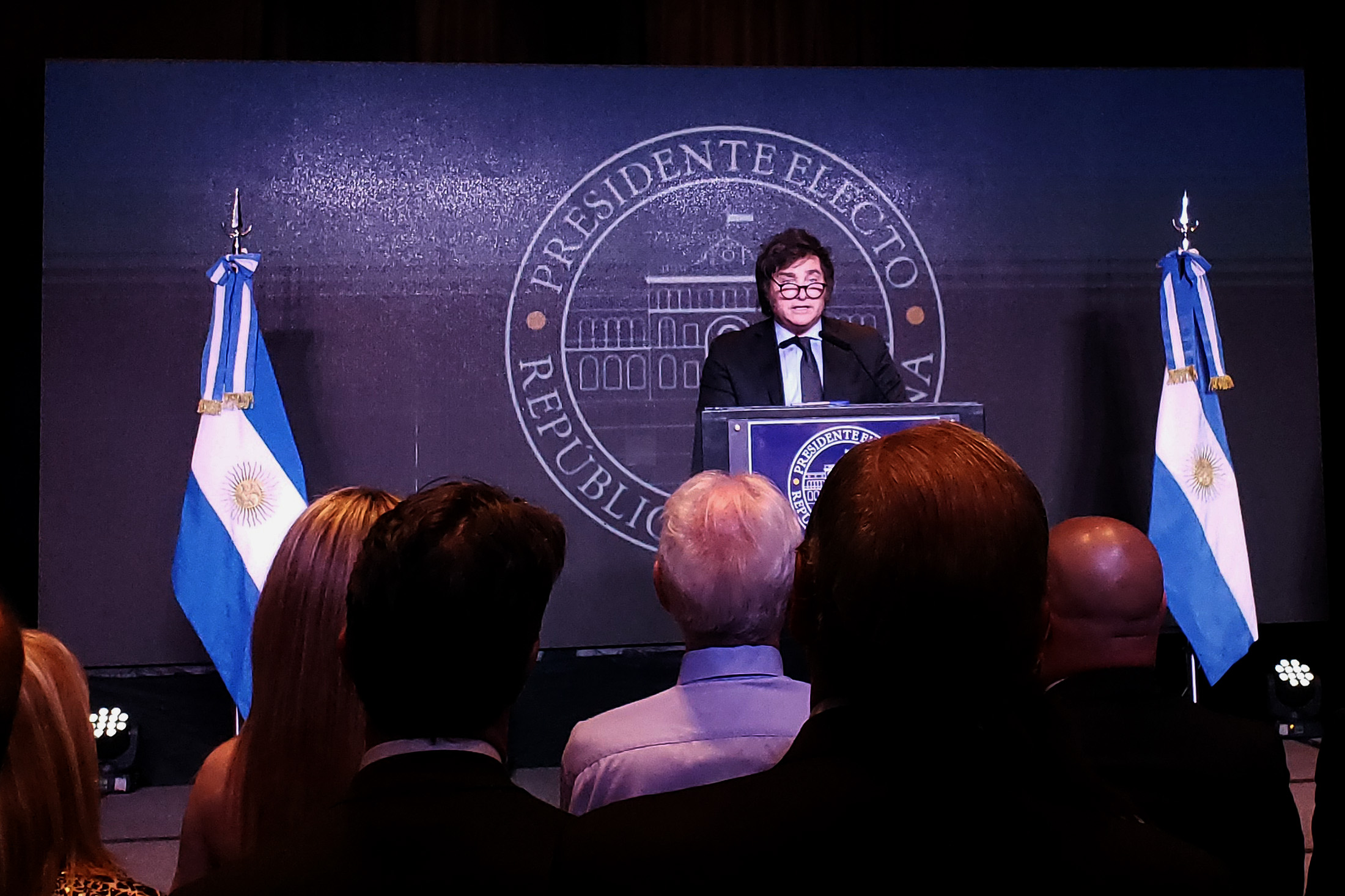 米莱将南美第二大经济体的状况描述为“危急”,并表示没有渐进主义的余地,暗示他将在12月10日上任之时采取极端措施。他补充说,他的政府将履行所有承诺并尊重私人财产,他是在宣读准备好的讲话稿。