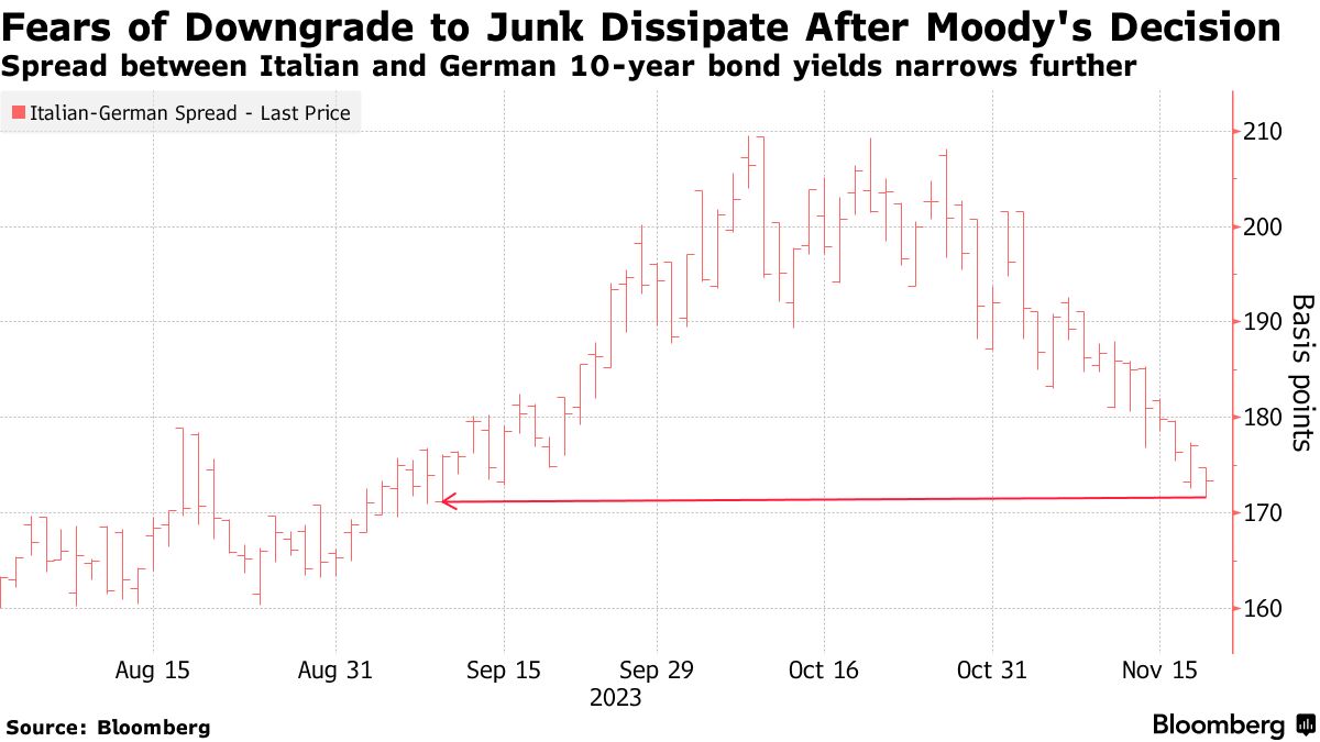 投资者持有意大利债券而非更安全的德国债券所要求的额外收益率降至自9月初以来的最低水平,此前穆迪投资者服务公司将意大利的信用评级从濒临垃圾级别上调。