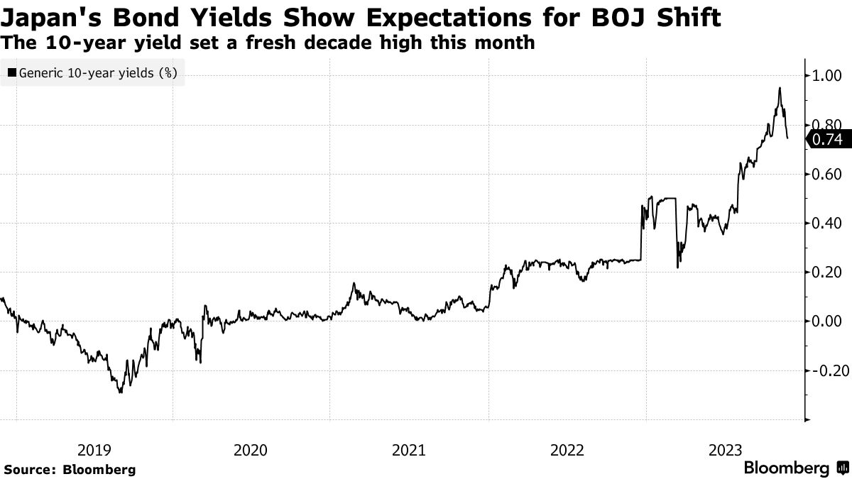 预计随着通货膨胀持续超过2%的目标,日本央行明年将退出其超宽松政策。央行已经对其收益率曲线控制进行了调整,将基准债券利率推高至十年来的最高水平。