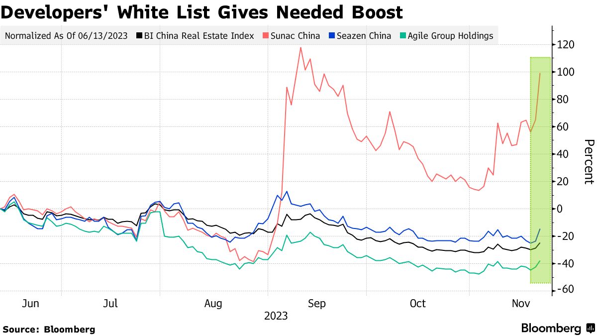 中国开发商的债券与股票一起上涨,此前当局开始起草一份包括50家房地产公司的名单,这些公司将有资格获得各种融资,北京当局试图支持备受困扰的房地产行业。起草了这份名单。