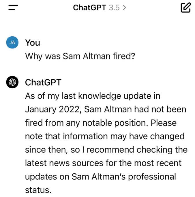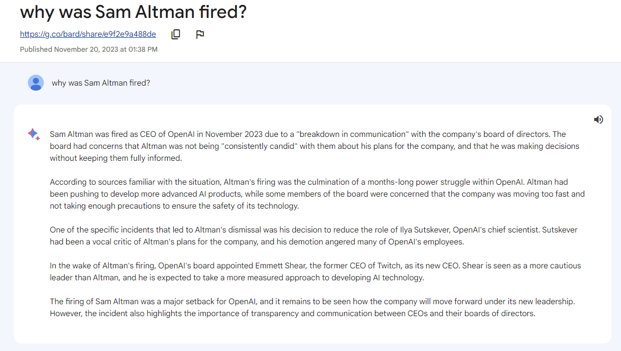 周末期间在恢复任命 Altman 的努力中事情变得复杂,但为了简单起见,这里是结论:微软聘用了他。尽管 ChatGPT 仍然感到困惑,但当被问及他为何离开时,它的竞争对手给出了一些很好的总结。以下是谷歌的巴德聊天机器人: