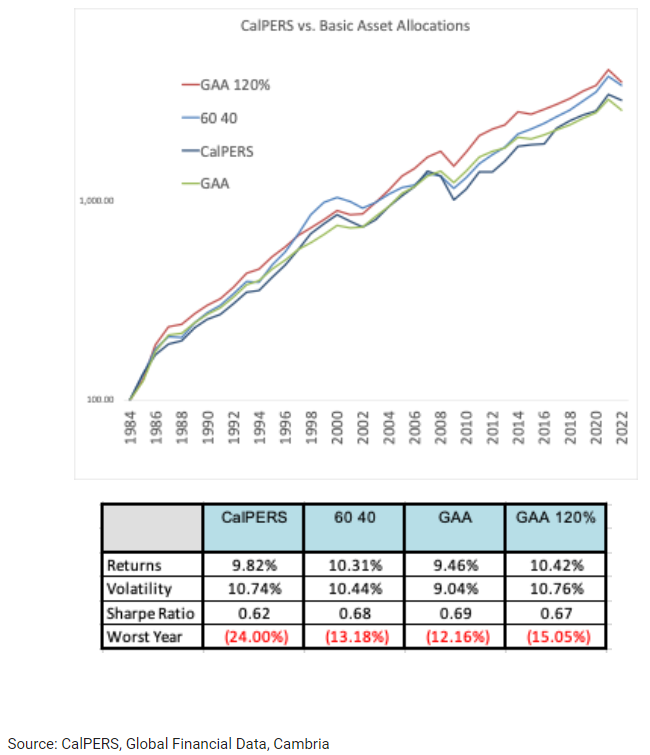 没有人能指责加州公务员退休基金管理局不努力;其投资政策文件长达118页,可以在这里找到。它进行了大量研究,并声称自己是一位管理者,其他人可以效仿。但这些好处并没有转化为系统及其受益人的利益。Faber提供了这张图表,将其回报(深蓝色)与直接的60/40资产配置以及他在十年前出版的开创性著作中提出的两个版本的全球资产配置进行了比较。(我在这里写过,您也可以观看相关视频。)在加州公务员退休基金管理局的努力工作之后,它成功地略胜于Faber建议的资产配置的非杠杆版本,但落后于使用20%杠杆的版本,以及直接的60/40策略: