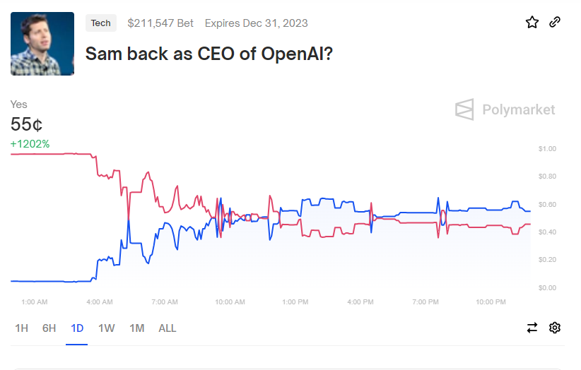 这是PolyMarket上的合约,目前赌徒认为Sam Altman有55%的机会在2023年底回归CEO职位。