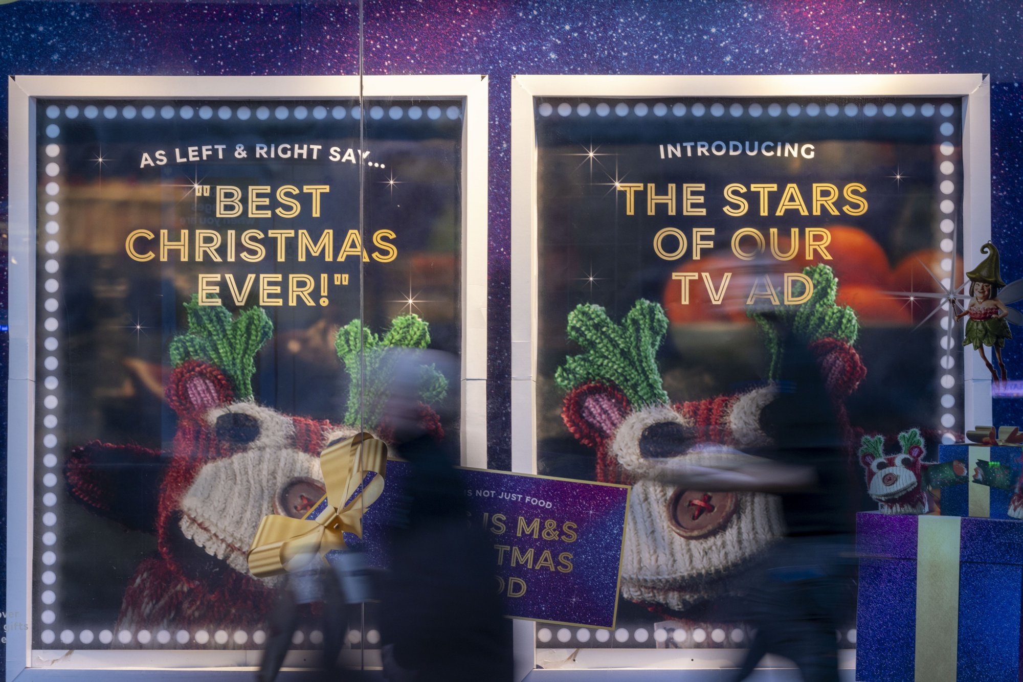 行人经过英国吉尔福德的一家Marks & Spencer Group Plc商店外的圣诞广告。