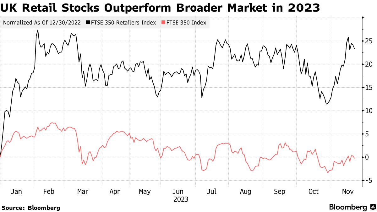 英国零售商将迎来自2019年以来的最佳一年,该行业指数上涨24%,受益于疫情限制结束后顾客重返实体店。尽管人们担心消费支出放缓,Marks & Spencer Group Plc股价在2023年翻了一番,Next Plc和廉价零售商B&M European Value Retail SA的股价均上涨超过30%。