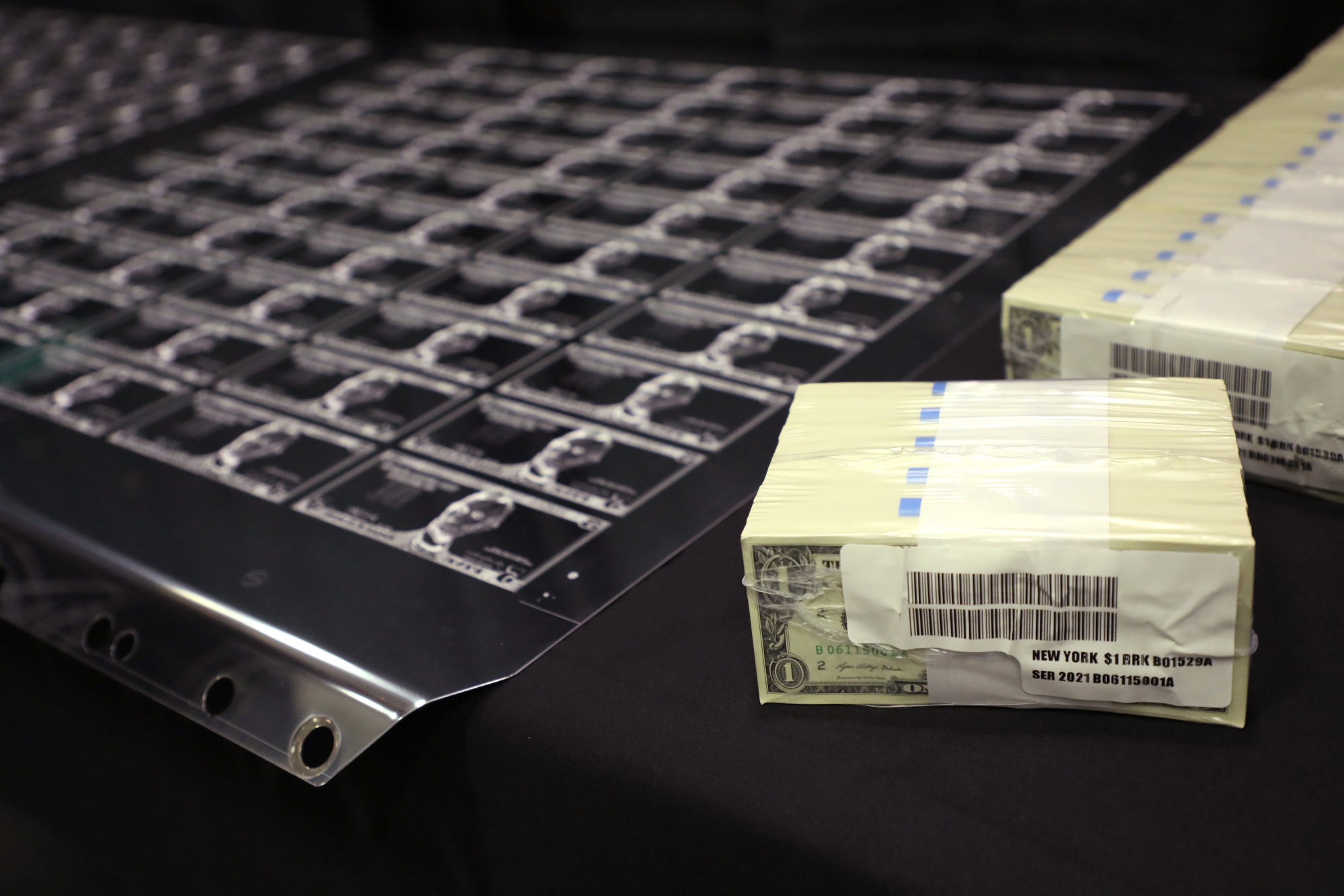 在德克萨斯州沃思堡的美国印刷局西部货币设施,一块雕刻板和一捆美元。