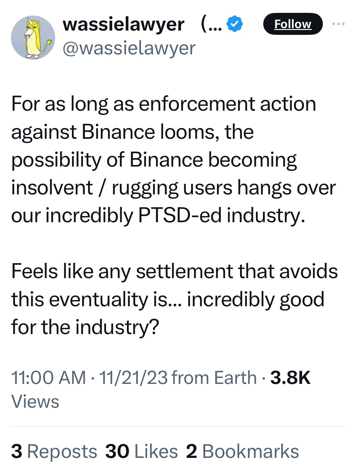 来源:@wassielawyer然后,在潜在协议的消息公布后仅几个小时,美国证券交易委员会指控币安的竞争对手交易所Kraken违反证券法,这是该公司不到一年内的第二次投诉。监管机构声称Kraken混合客户资产和自有资金,并未经适当许可运营其交易所,而该平台表示不同意这些指控。比特币和币安币(与该交易所相关的代币)的价格出现了一些波动,但整体市场似乎对这两条消息都持平常心。
