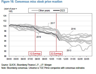 根据摩根大通公司首席日本股票策略师Rie Nishihara的分析,自4月份开始的本财年以来,未达分析师预期的公司股价下跌约6%,比过去10年的平均水平高出两个百分点。她表示,相比之下,对业绩超预期的反应与历史平均水平一致。