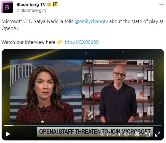 今天在彭博电视台的权力平衡节目中,主持人安玛丽·霍登和乔·马修将采访财政部副部长沃利·阿代约谈论对币安的执法行动。早些时候在彭博电视台上,微软CEO萨蒂亚·纳德拉表示他致力于OpenAI联合创始人萨姆·阿尔特曼。