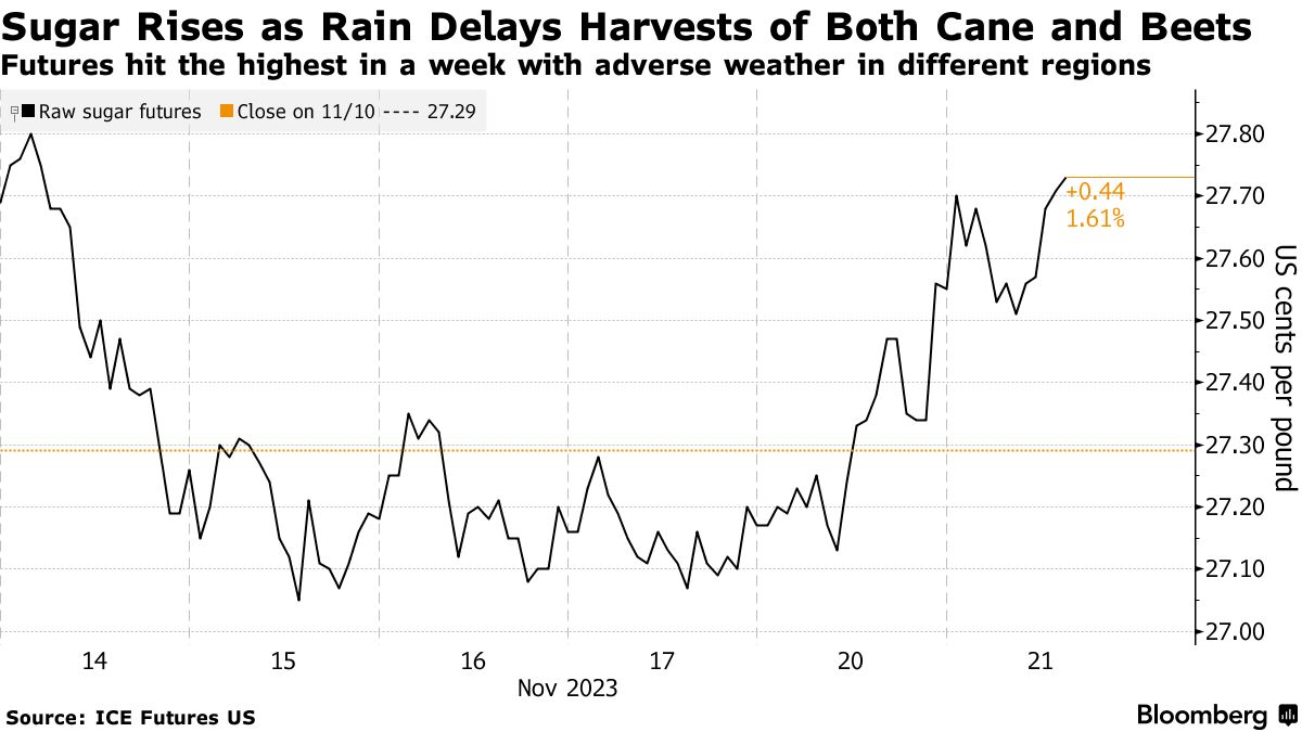 糖价因巴西和欧洲雨水延迟收割而达到每周最高点-彭博社
