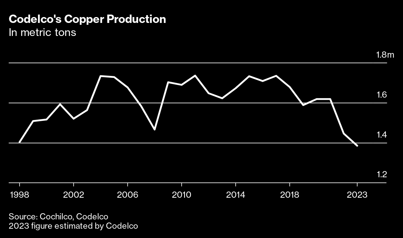 在新任首席执行官Ruben Alvarado的领导下,Codelco正在努力将产量从今年的130万吨左右(25年来的最低水平)提高到本年代末前的每年约170万吨的前疫情水平。