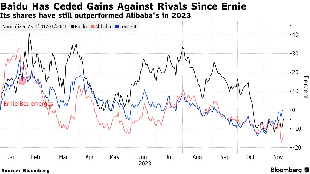 该公司今年实现了对OpenAI的ChatGPT的首次重大回应,7月至9月的营收略高于预期,增长了6%,达到344亿元人民币(48亿美元)。该公司的生成式人工智能模型Ernie应该有助于在2023年第四季度产生数亿元人民币的额外广告收入,公司估计。其股价在纽约盘前交易中上涨了超过1%。