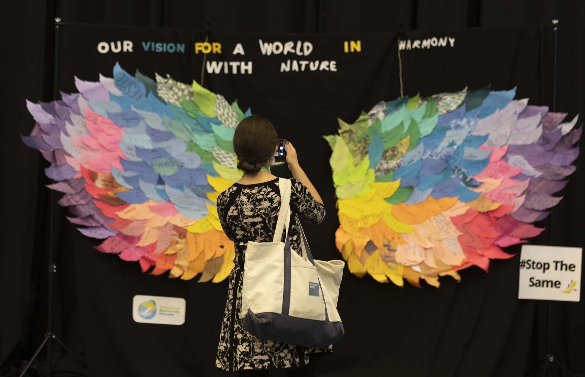 与会者在加拿大蒙特利尔举行的联合国生物多样性大会期间拍摄了一张排列成翅膀形状的信息照片。