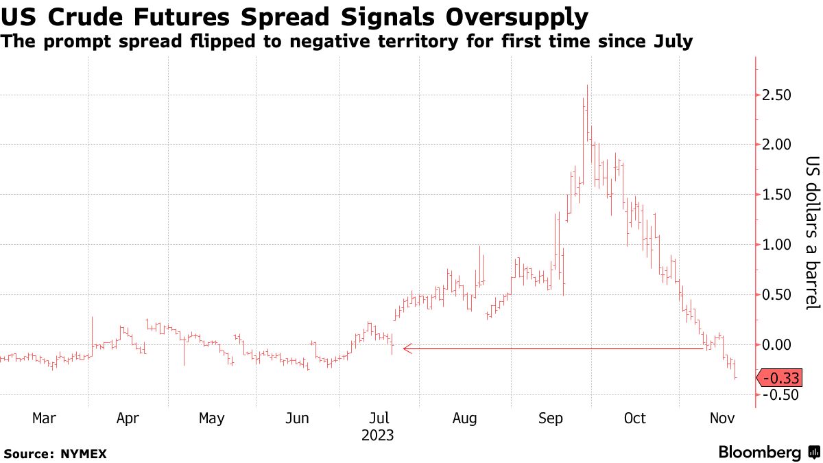 上次库欣储油点的库存低于这个水平时,即期价差是一种超过每桶3美元的看涨返照结构。截至周一,即期价差为33美分的远期溢价,领先于12月合约的到期。在到期前,交易者会平仓,因此价差交易可能会波动。