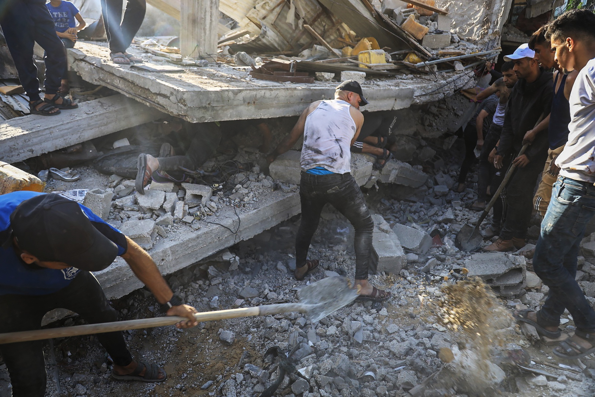 人们在加沙汗尤尼斯一栋被以色列空袭摧毁的建筑物残骸中搜寻,时间为11月18日。摄影师:Ahmad Salem/Bloomberg中国国家主席习近平在金砖国家峰会上呼吁释放以巴战争期间所有被拘留的平民,并重申要立即停火。